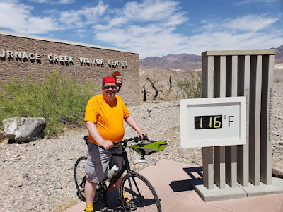 One of the most memorable experiences was riding up to the visitor's center. An entire bus load of tourists all started taking my picture. I didn't understand their language but I am sure they were saying look at this crazy guy riding a bike in this heat. The large thermometer in front of the building indicated 116F at the time.